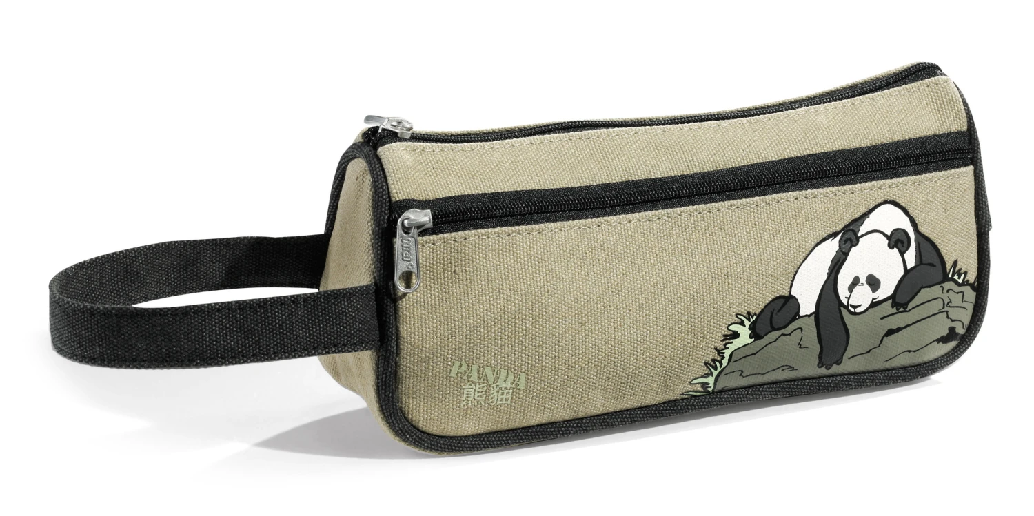 Baumwoll-Stiftemäppchen oliv mit bedrucktem Panda-Motiv, Trageschlaufe und zwei Reißverschlussfächern.