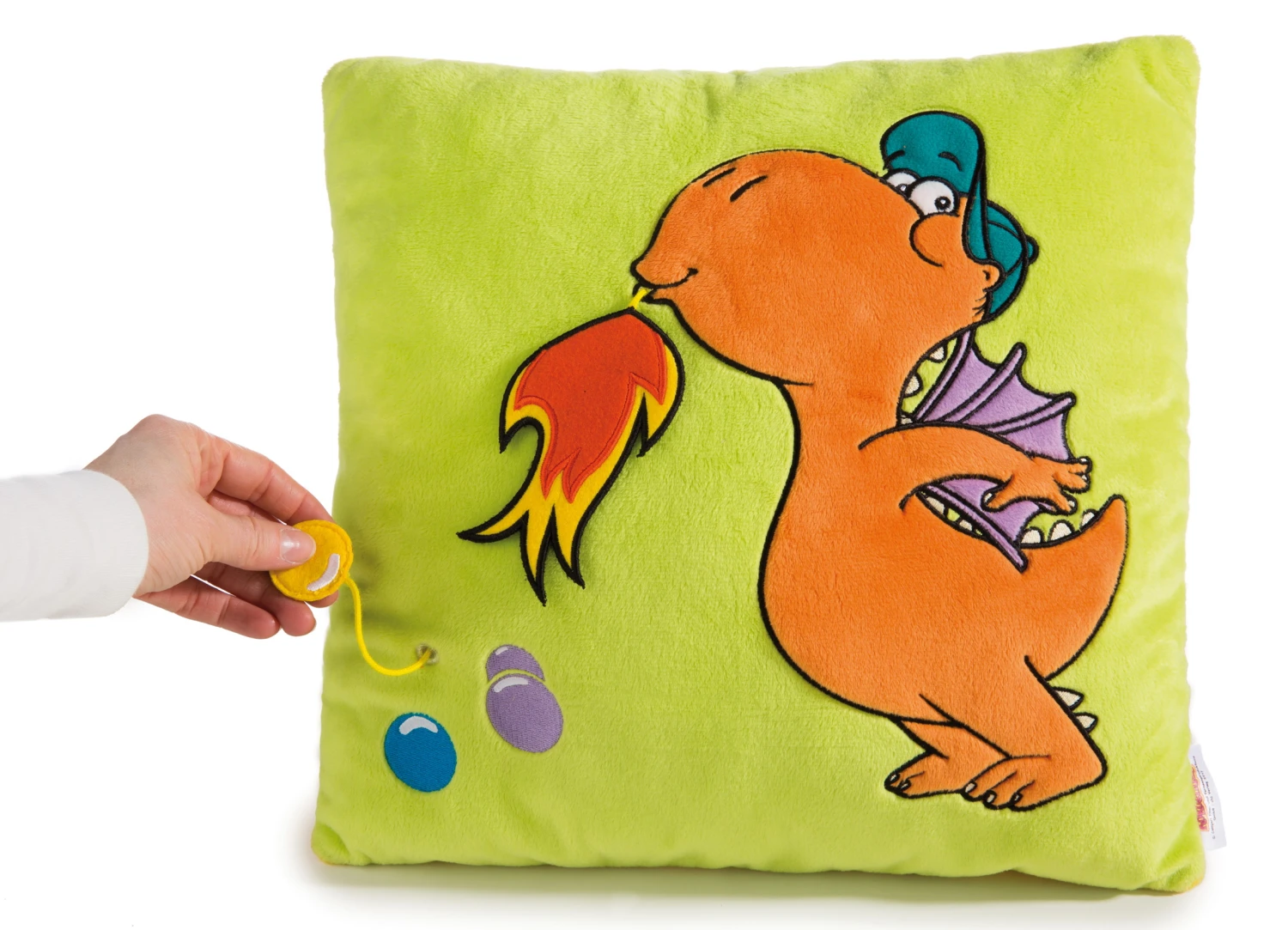 Die Flamme und die gelbe Seifenblase auf dem Kissen sind mit einem Band miteinander verbunden. Sobald man an der Blase zieht, geht die Flamme in Richtung des Mundes vom kleinen Drachen Kokosnuss.